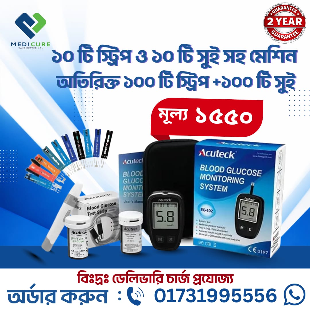 ১০ টি স্ট্রিপ এবং ১০ টি সুই সহ Acuteck Glucose Meter মেশিন অতিরিক্ত ১০০ টি স্ট্রিপ এবং ১০০ টি সুই